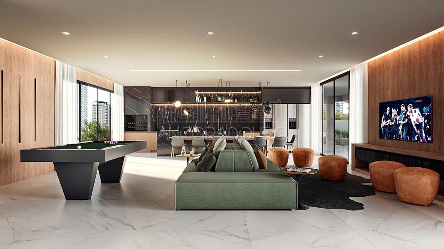 - Living e áreas sociais com piso de porcelanato em grandes formatos