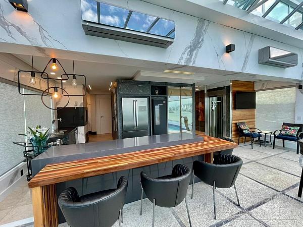 - Área de Festa com cozinha completa e churrasqueira ( com paredes laterais de vidro duplos laminado e temperado)